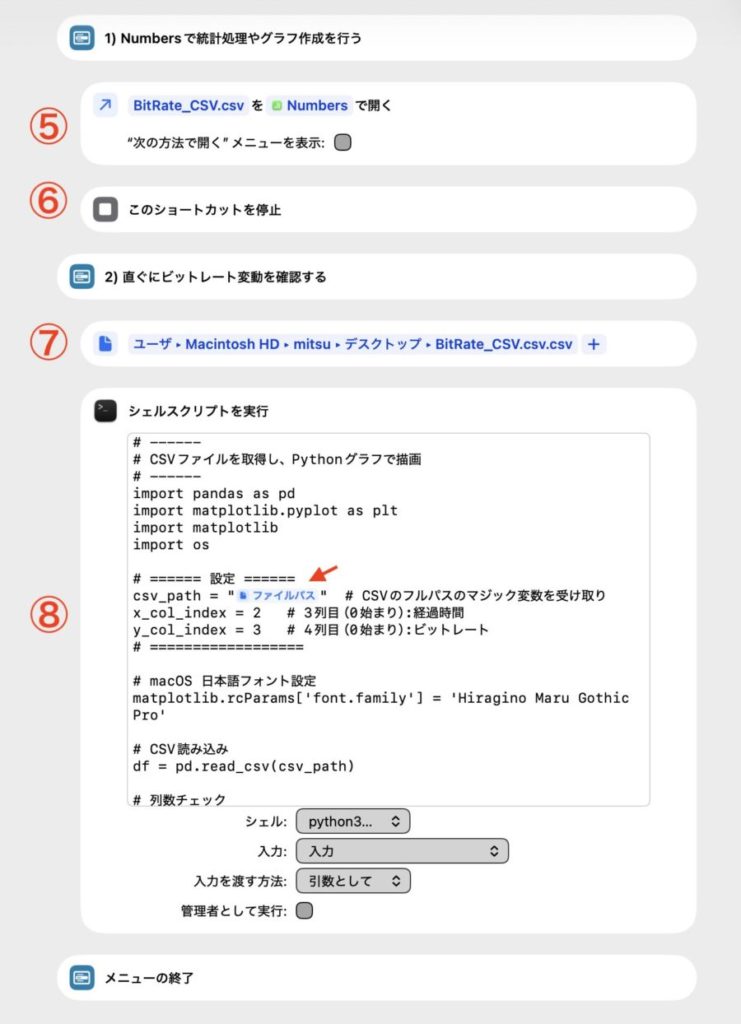 このアクションは、デスクトップの BitRate_CSV.csv を指定してNumbers アプリを開きます。 下に示すように、Numbers上で統計計算や散布図によるビットレート変動・グラフも作成することができます。