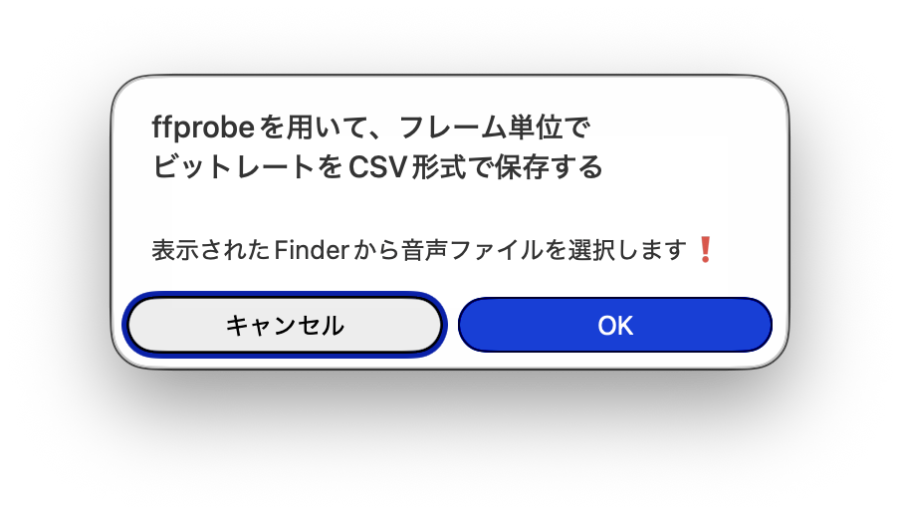 このアクションで、Finderが開きビットレート変動をCSV化したい一つの音声ファイルを選択します。 選択されたファイルはファイルパスなどがマジック変数としてこのアクションから出力されます。