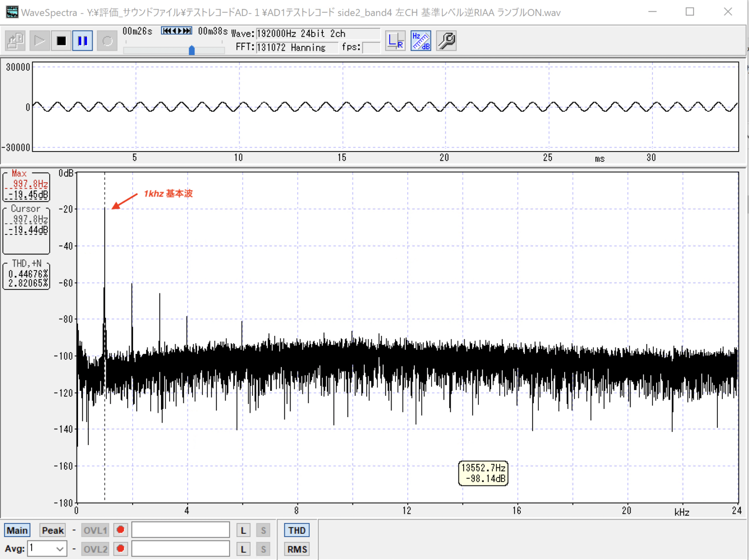 使用したのは、テストレコード「AD-1」Side 2 の「バンド4:基準レベル(1kHz・3.54cm/sec 尖頭値・左チャネル)」を、DENON製 MCカートリッジ DL-103Rで再生した際のスペクトルです。