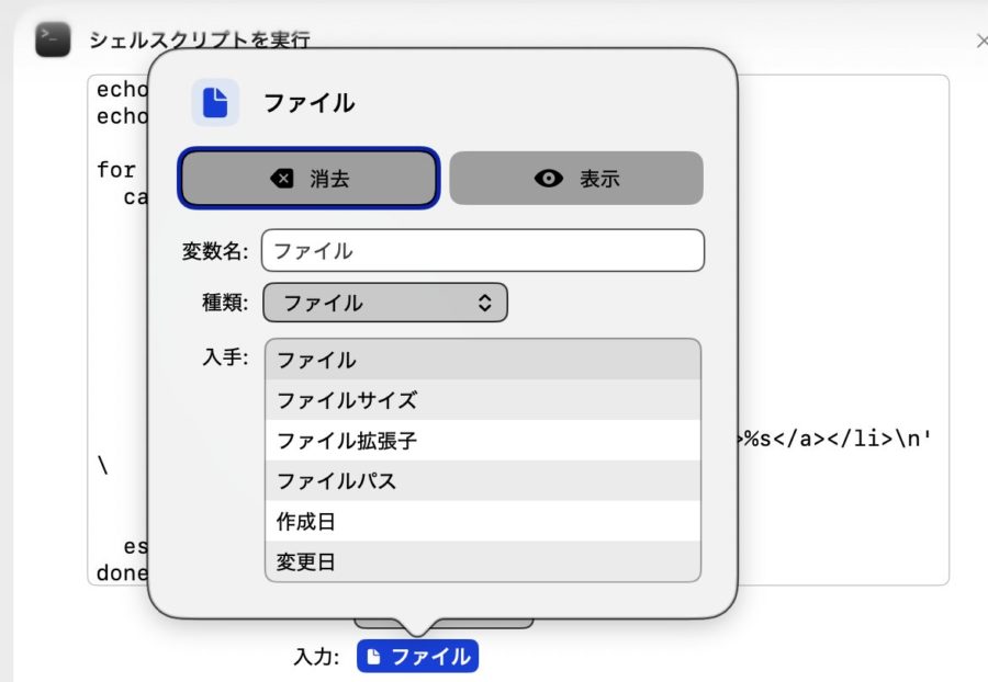 例えば、「ファイルを選択」アクションの場合で拡張子付きのファイルを選ぶことが出来ません。 この場合は、(シェルスクリプトから実行)アクションを使って basenameで拡張子付きのファイルを取得するのが手っ取り早く処理できます。