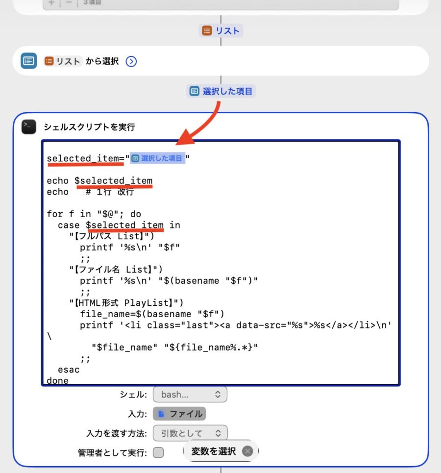 下の例の、1行目の selected_item="選択した項目" に着目してください。 これは、変数:selected_itemに(リストア)クションで選択した マジック変数  "選択した項目" を入れています。 これで、シェルスクリプト内で 変数:selected_item が使用出来るようになります。