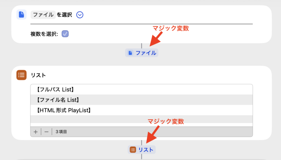 ショートカットアプリを使った【ファイル名の取得 リスト選択】プログラムの作成手順を示します。 マジック変数と必要事項をフォーカ(特記)しています。