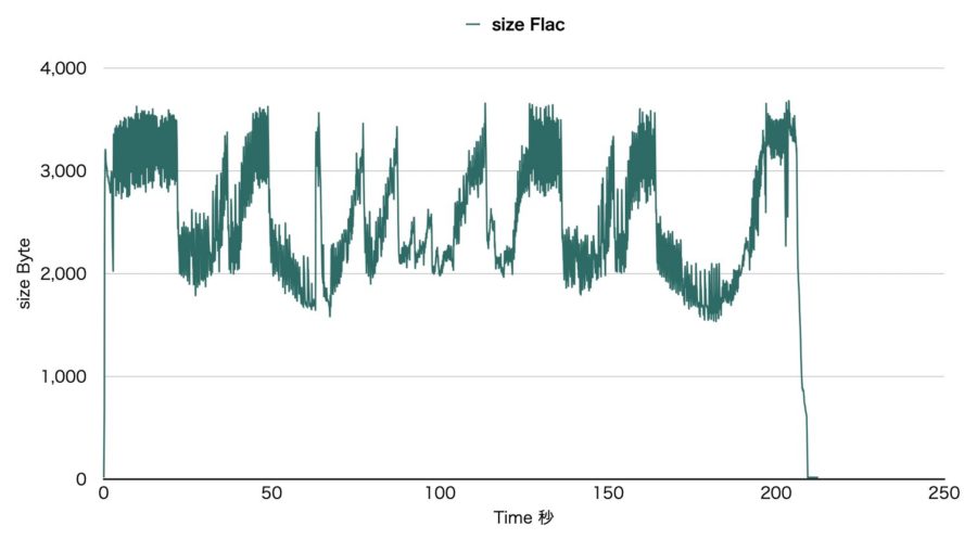 一方、CSVデータ(timeとsize)を活用することで、Numbers(又はExcel)の散布図からフレーム毎の転送サイズ(Byte)の変動を、高分解能で容易に可視化することができます(Fig-3)。 転送サイズの変動はビットレート変動と相関するため、グラフの形状はフレーム単位のビットレートと相似し、ビットレート変動のパターンを把握する有効な手段です。 なお、転送サイズ(Byte)からセル計算によりビットレートに変換することも可能なので、ビットレート変動グラフを表示させることもできます。