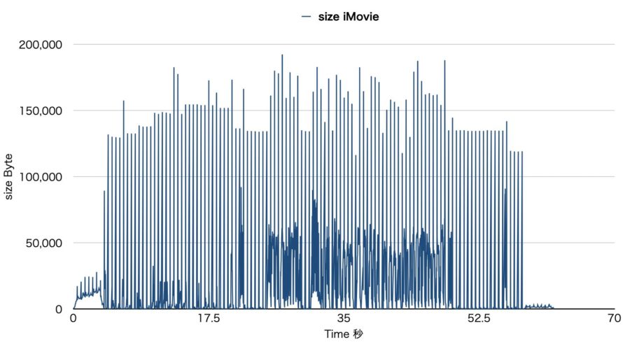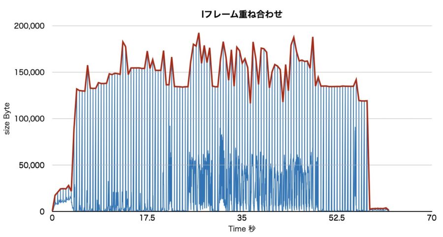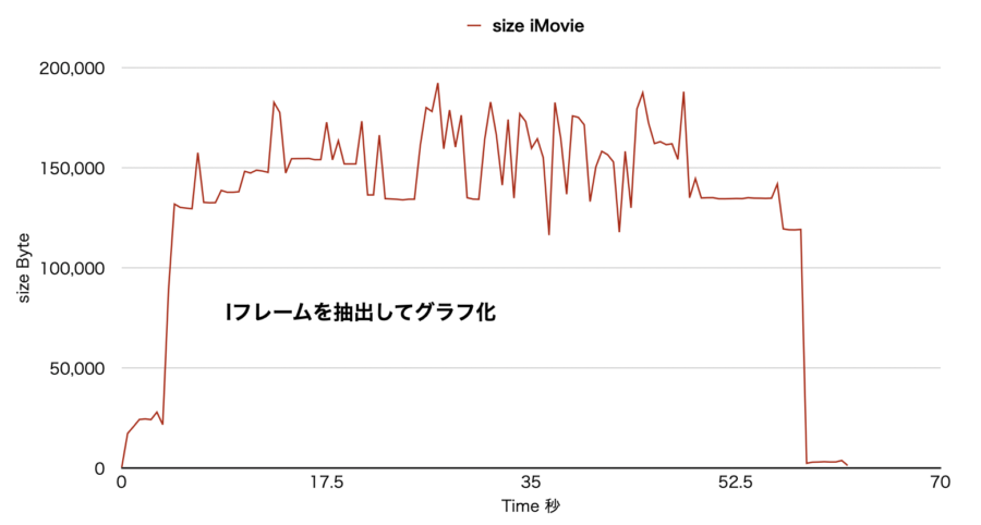 Fig-3は、iMovie・動画ファイルのCSVデータでグラフ化しています。 今度は、pict_typeのIフレームでフィルタをかけてグラフ化したのが、下図になります。 この図から、Fig-3 に多く含まれているスパイク状のパターンが、Iフレームに対応していることが確認できました。 iMovieで出力されたビデオファイルは、画像編集を容易にするため、Iフレームが多く含まれていると考えられます。
