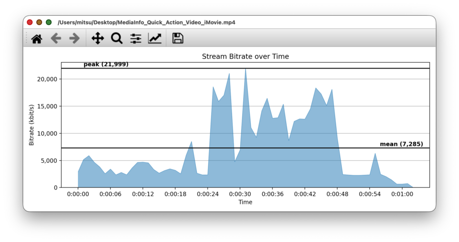 plotbitrate CLIは、動画および音声ファイルのビットレート変動グラフを簡便に描画するコマンドラインツールです。 さらに、ビットレートデータをCSV形式でエクスポートし、Numbers(Excel)など表計算ソフトで詳細なビットレート変動のグラフ化や統計データの分析が可能です。