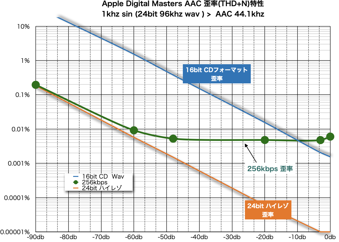 XLDは -3db 以上での歪率が僅かにCDより劣っていました。 実際の所、ハイレゾ録音は通常ノーマライズを-3dbで実施するのが普通です。 よって、実際上-3dbを超えた音源をAAC変換することは無いので「XLD CLI アプリ」に於いては悪くてもCD歪率と同等と思われます。 更に、-20db以下であれば圧倒的にCDの歪率より優れた結果になります。