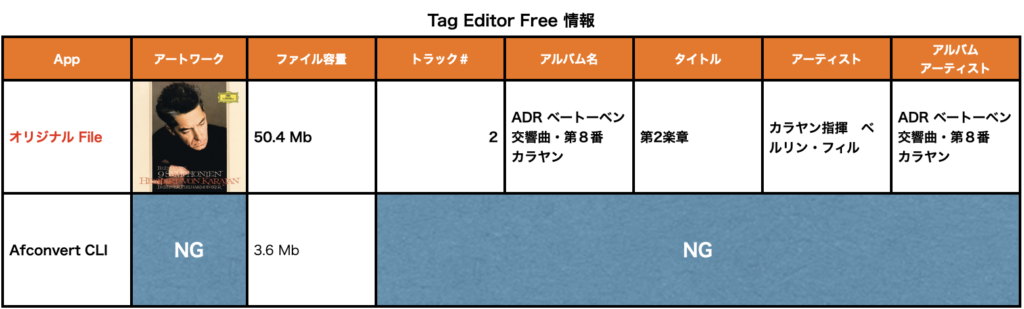 Tag Editor Freeアプリ を利用して、ハイレゾ音源をAAC変換した時にタグ情報が引き継がれているか確認する。