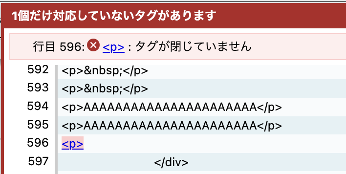Affinger6の旧エディタで編集中の頁に「ページ区切り」 <!--nextpage-->を挿入して、確認のためプレビューするとChrome拡張機能の「HTMLエラーチェッカー」で、 " p タグが閉じていない" との構文エラーが発生します。 pタグエラー箇所は、ページ分割されたすぐ上の部分(行)に当たります。